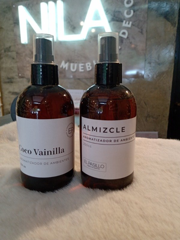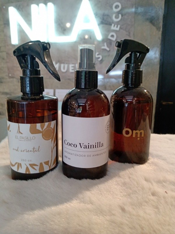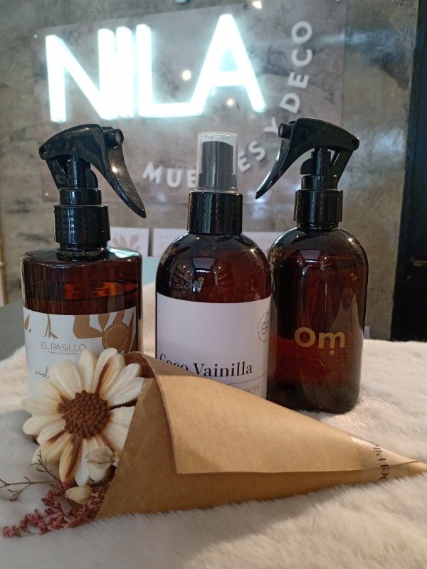 Aromatizador de tela y ambiente en envase plástico color ámbar. Calidad premium